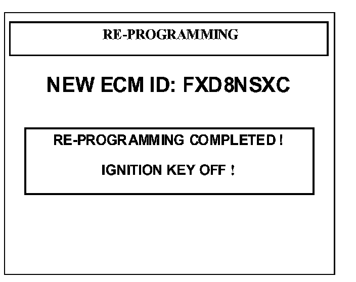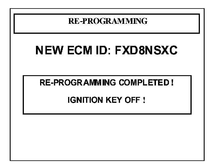 14. When "REPROGRAMMING COMPLETED" message is displayed, turn ignition key to the "OFF" position and disconnect Hi-Scan Pro from the vehicle. Wait at least 20 seconds, start vehicle and verify normal operation.