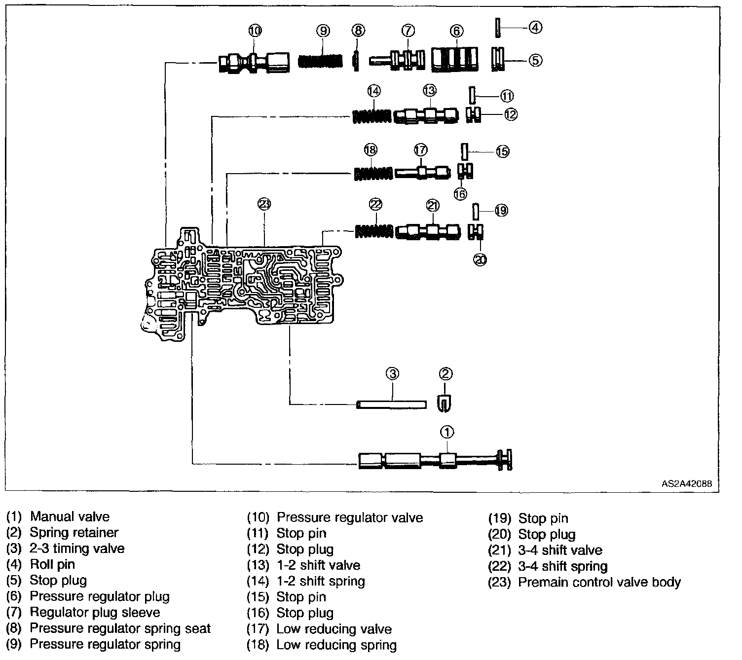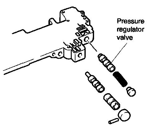 4. Insert pressure regulator valve, pressure regulator spring, pressure regulator spring seat, regulator plug sleeve, pressure regulator plug and stop plug. Secure them with roll pin.