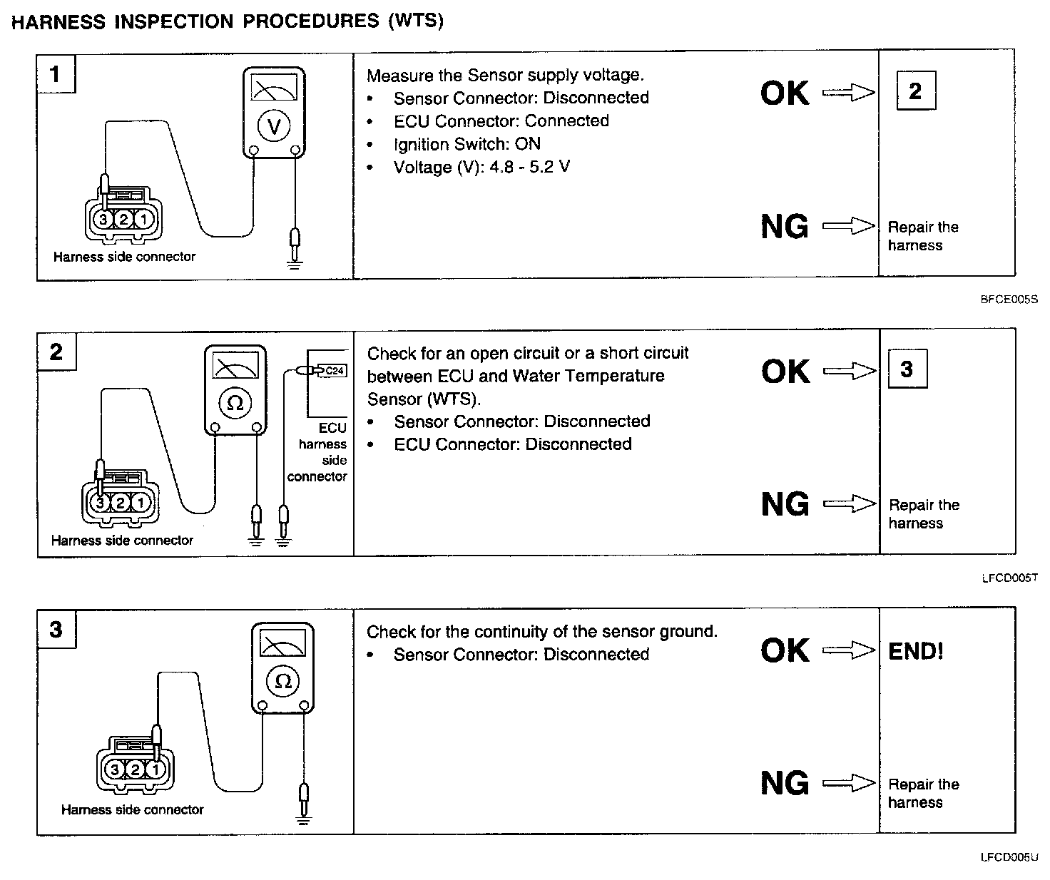 If the fast idle speed is not adequate or the engine gives oft dark smoke during warm-up, the Water Temperature Sensor (WTS) might be the cause.