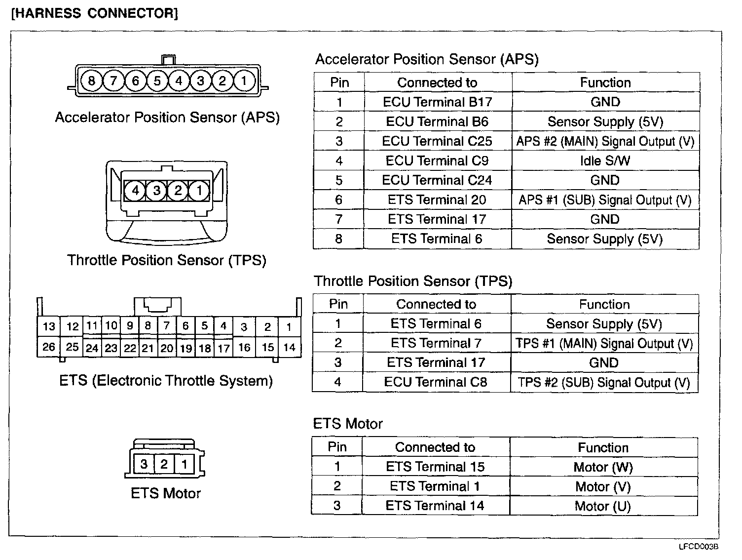 They have two circuits in sensor module, one is flowed to ECU and the other is flowed to ETS. ECU calculates the throttle target value with the signals from APS #2 (MAIN) and TPS #2 (SUB) and the ETS control module controls the ETS motor with the signals from APS #1 (SUB) and TPS #1 (MAIN).