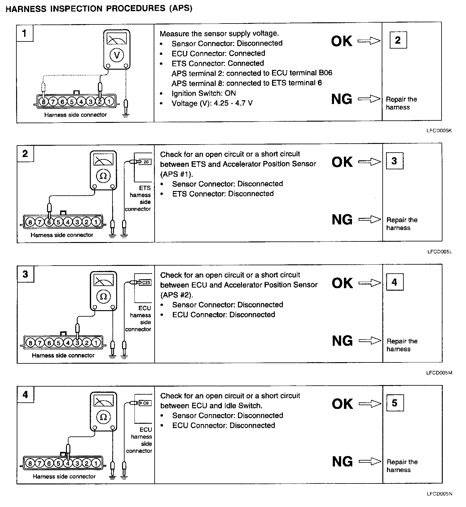 5. Replace the APS if the sensor signal is out of range and is not directly proportional to the accelerator pedal angle.
