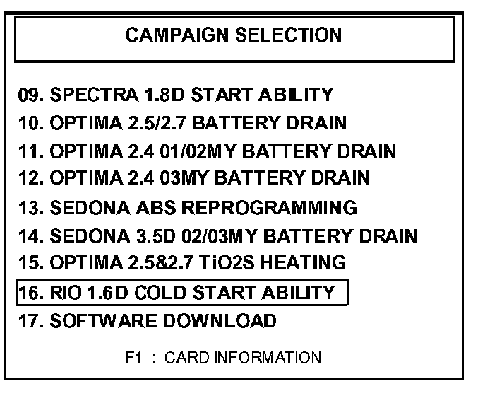 2. Turn the Hi-Scan Pro on and select option "16. RIO 1.6D COLD START ABILITY" and press the "ENTER" key.
