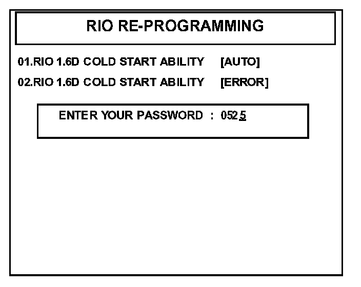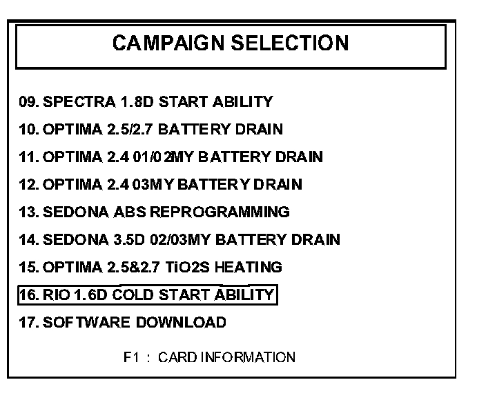 4. Turn the Hi-Scan Pro on and select option "16. RIO 1.6D COLD STARTABILITY" and press the "ENTER" key.