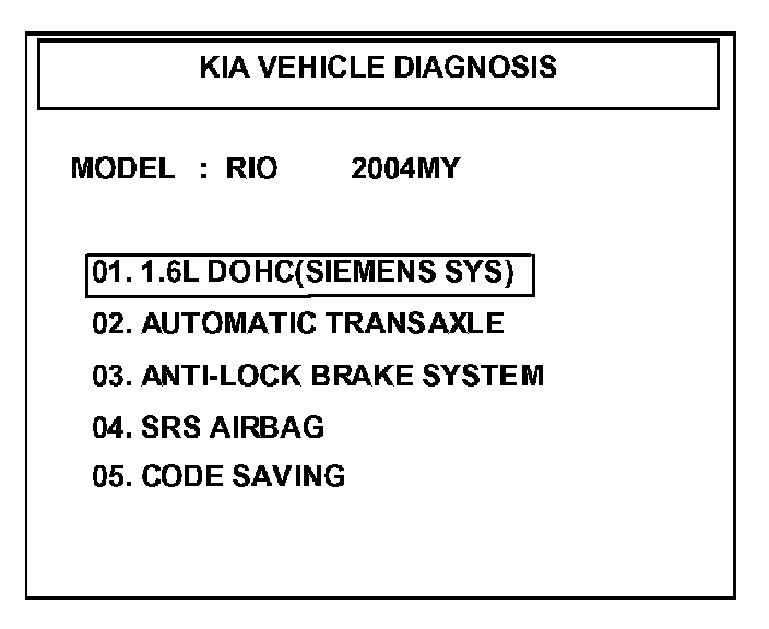 14. Select option "01. 1.6L DOHC (SIEMENS SYS) and press the "ENTER" key.