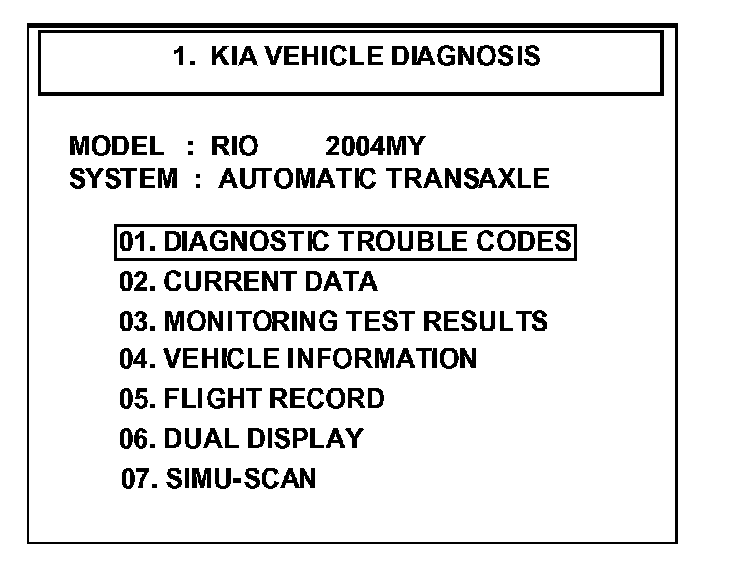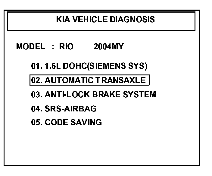 20. Press escape twice to return to the "KIA VEHICLE DIAGNOSIS" menu. Select option "02. AUTOMATIC TRANSAXLE" and press the "ENTER" key.