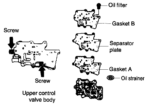 12. Set new gasket A, upper separator plate and new gasket B onto upper control valve body.
