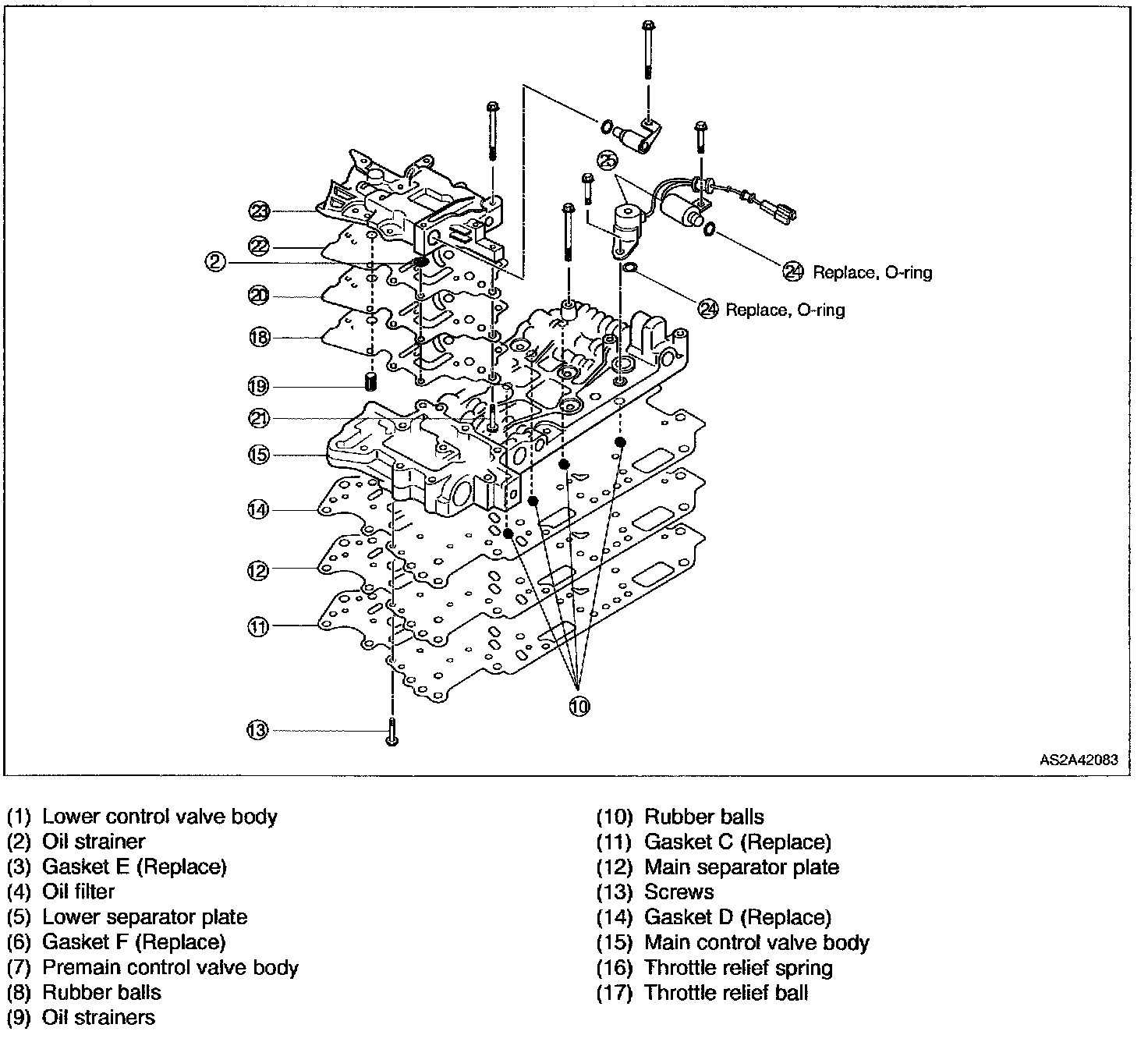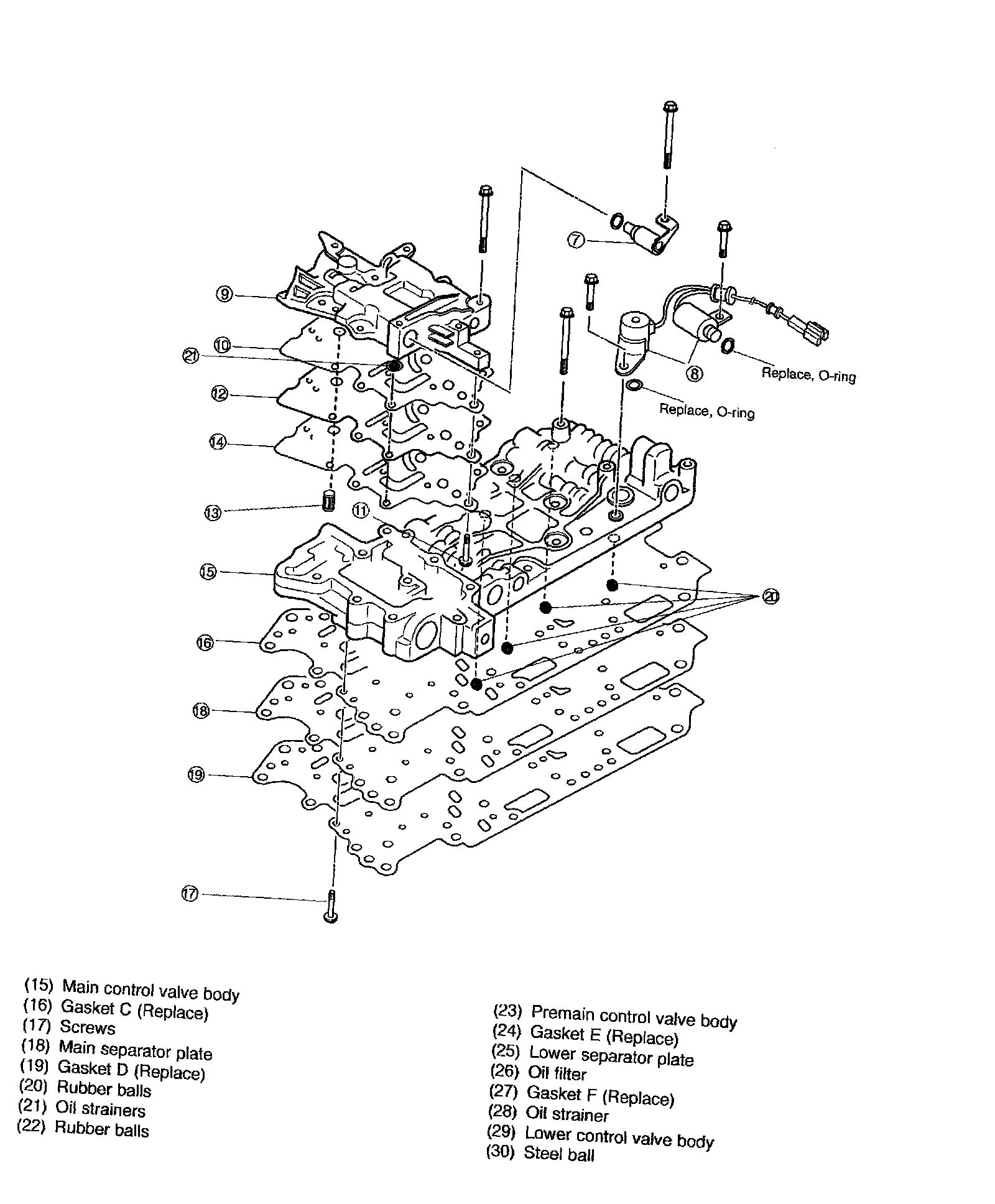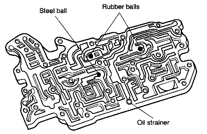 13. Remove oil strainer and two rubber balls from premain control valve body.