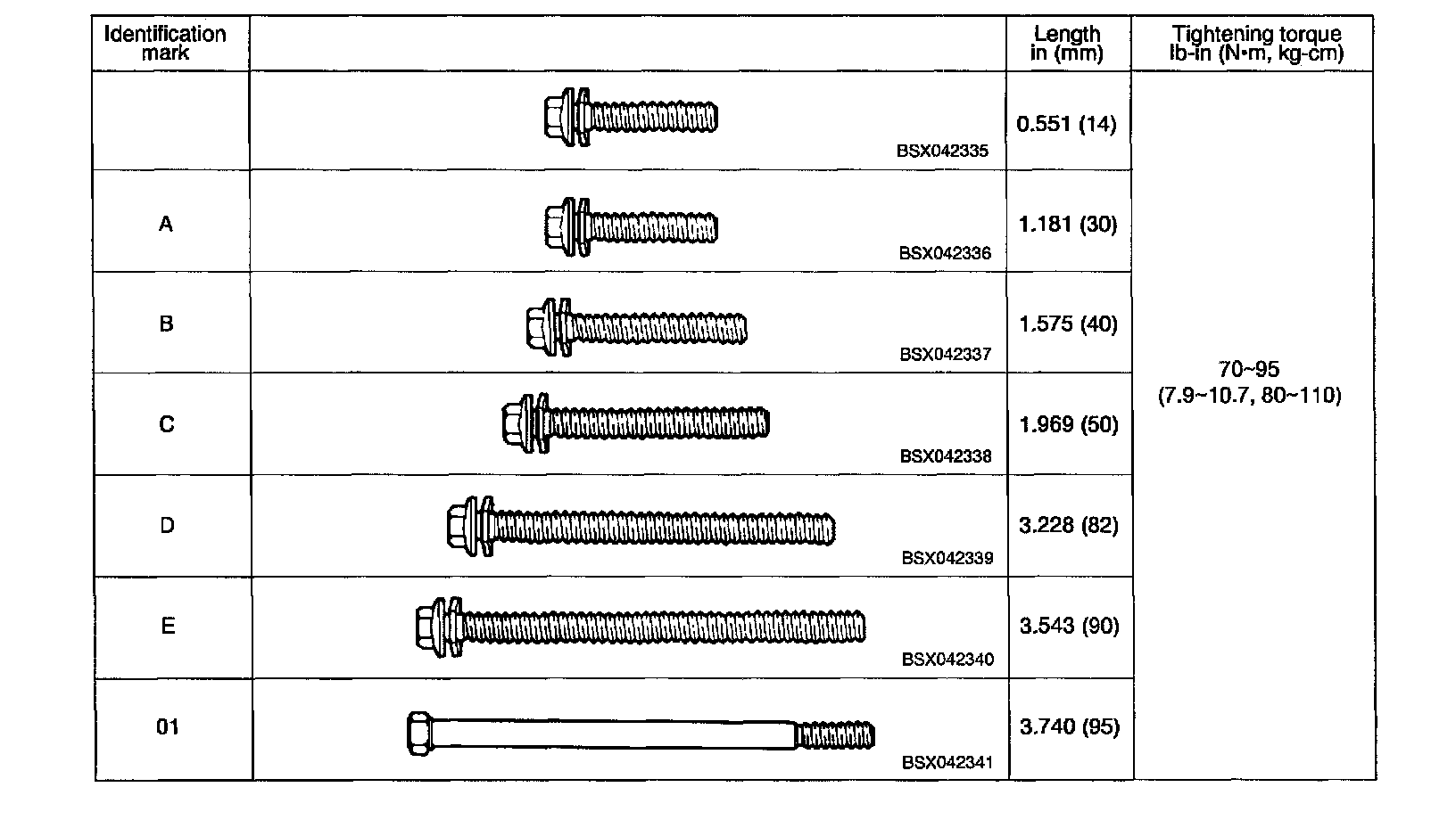 Tightening torque: 69.6 - 94.8 inch lbs. (7.9 - 10.7 Nm, 80 - 110 kg.cm)