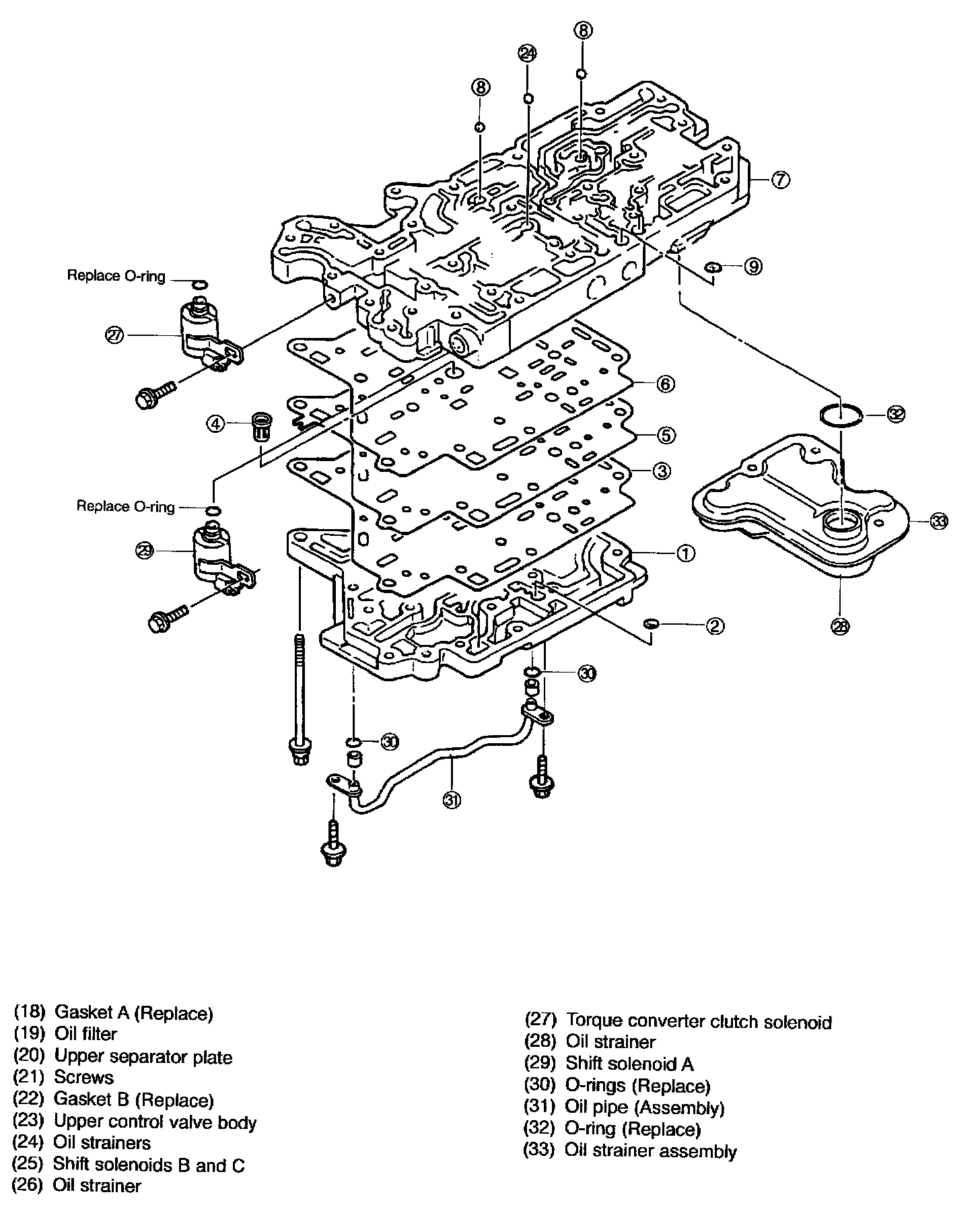 20. Install shift solenoid A and oil strainer onto upper valve body.