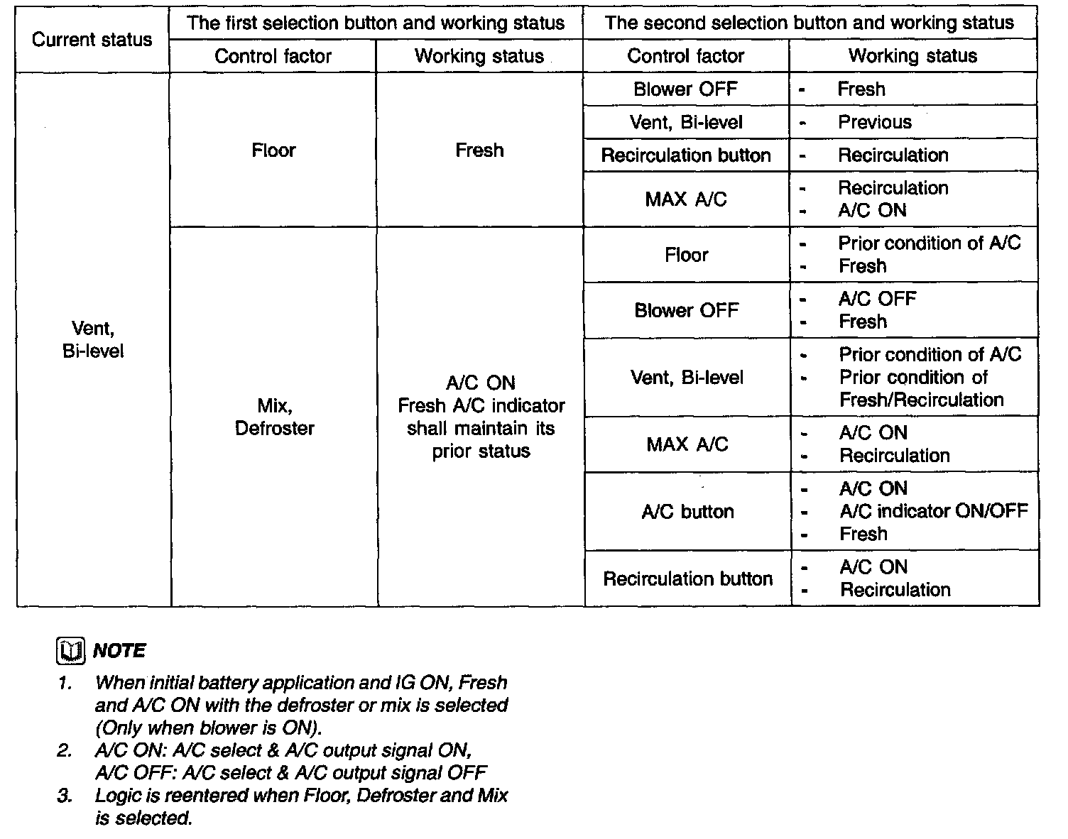 1. At initial battery application, A/C OFF (A/C ON when the mode is mix. defroster. MAX A/C when the Blower is ON)