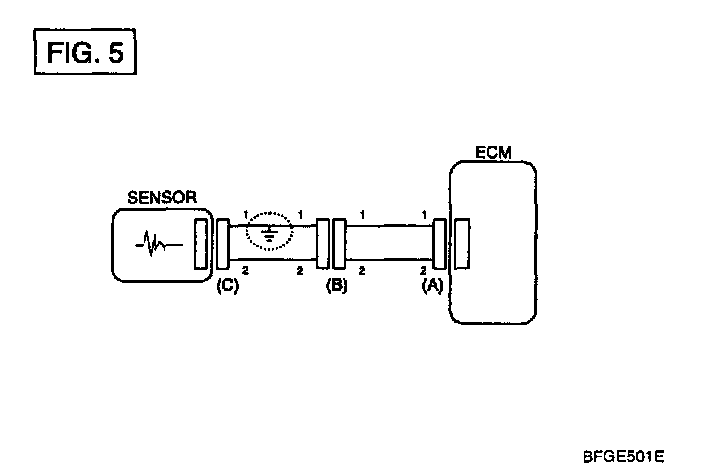 a. With each connector still connected, measure the voltage between the chassis ground and terminal 1 of each connectors (A), (B) and (C) as shown in [FIG.4].