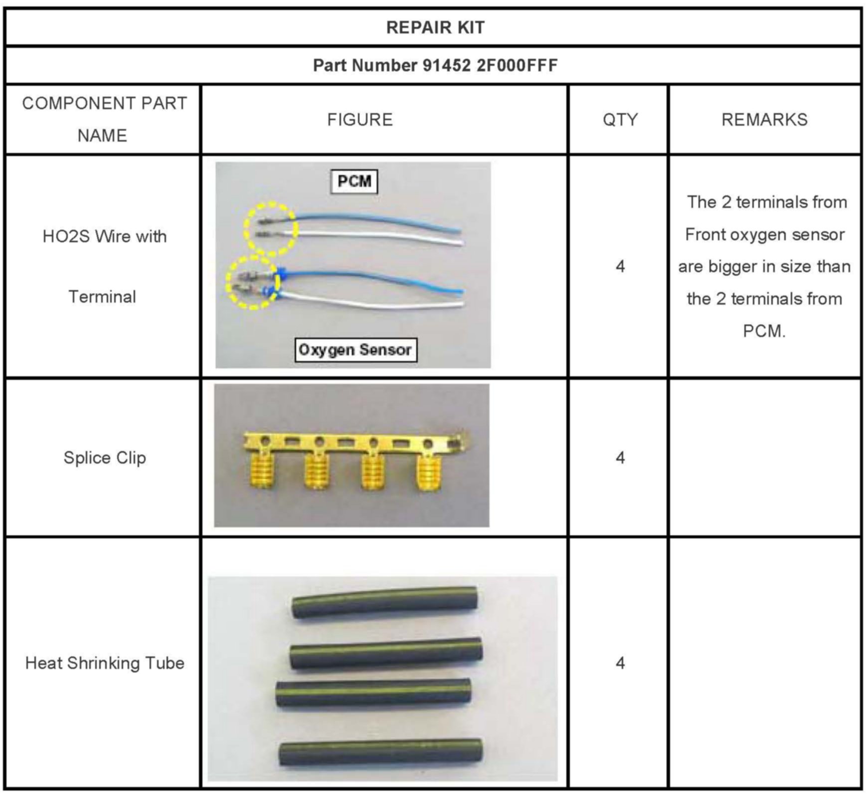 ^ If the same symptom happens to the vehicle for the second time of if the vehicle has a prior history of front oxygen sensor-related DTC concerns, replace the four terminals between the PCM and the front oxygen sensor heater terminals as shown, and in the REPLACEMENT PROCEDURES section of this TSB.