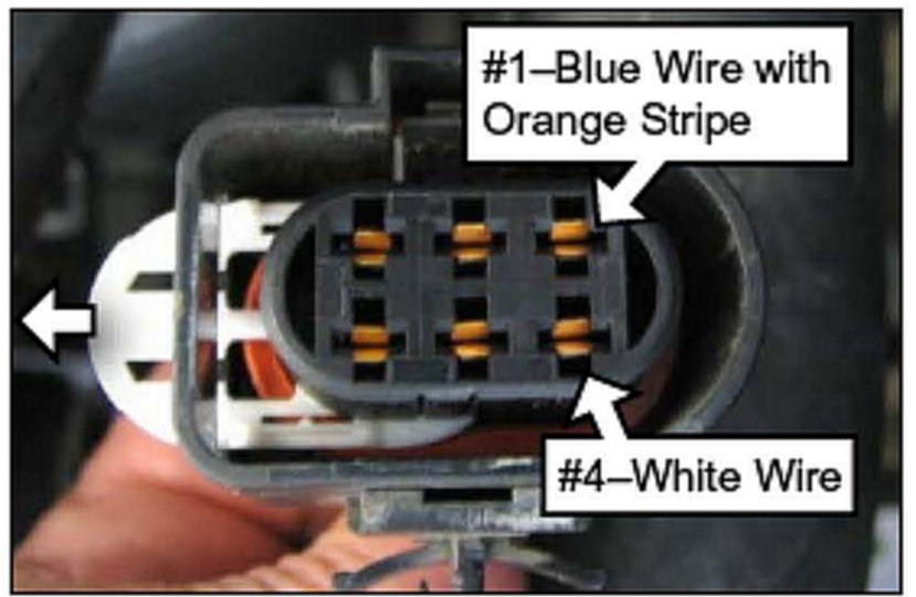 9. Remove the two terminals # 1 (Blue with orange stripe) and # 4 (White) using a two blade terminal removal tool. Locations of terminals 1 and 4 are shown in the picture above.