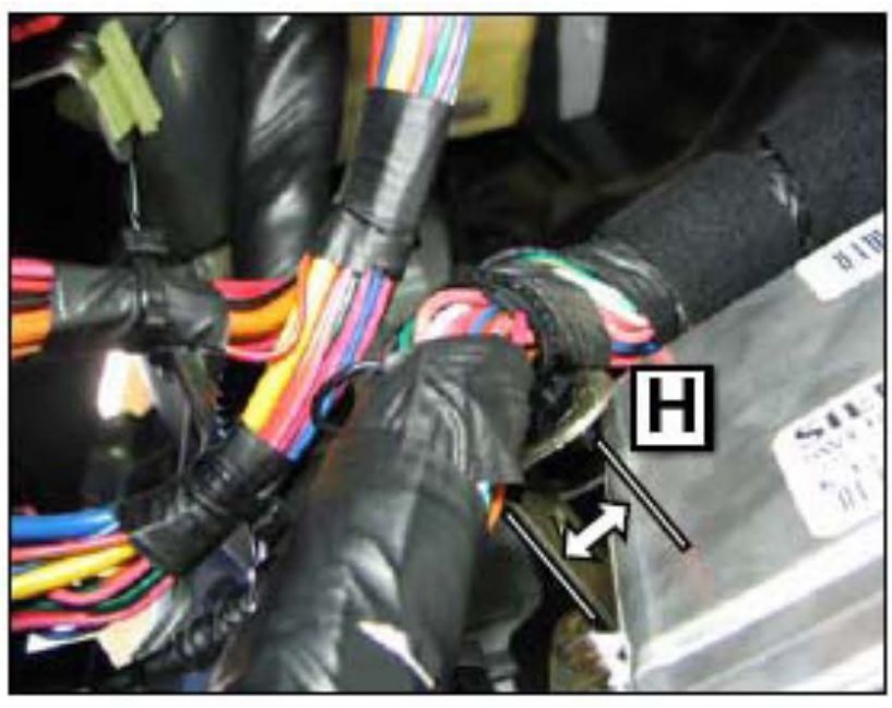 23. Slide the wiring harness down 0.8 inches through the wire tie at the PCM bracket (H) to relax the bend at the PCM connector and reconnect PCM connector. Reinstall the wire tie clip in the PCM bracket.