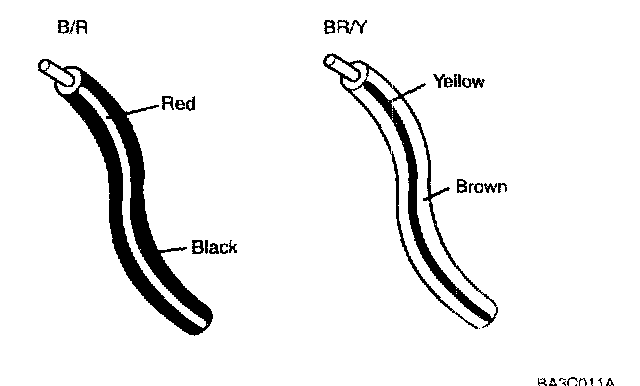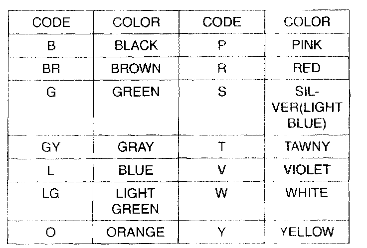 Two-color wires are indicated by a two-color code symbol. The first color indicates the base color of the wire; the second color indicates the color of the stripe.