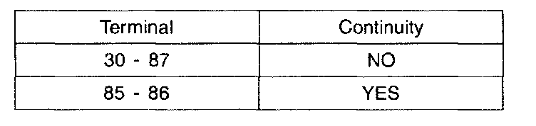 4. Apply 12V to terminal 85 and ground to terminal 86. Check for continuity between terminals 30 and 87.