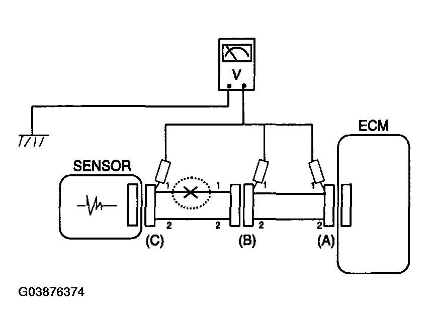 - With each connector still connected, measure the voltage between the chassis ground and terminal 1 of each connectors (A), (B) and (C) as shown in [Fig 4
