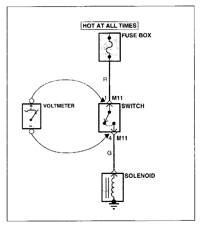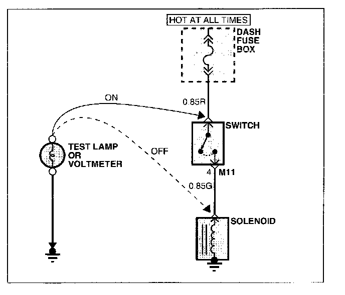 A. Connect one lead of a test lamp or voltmeter to a ground. If you are using a voltmeter, be sure it is the voltmeter's negative test lead you have connected to ground.