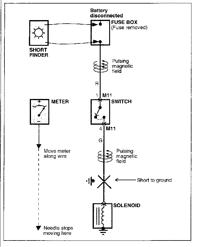 E. Beginning at the fuse box, slowly move the short tinder along the circuit wiring. The meter will show current pulses through sheet metal and body trim. As long as the meter is between the fuse and the short, the needle will move with each current pulse. Once the meter is moved past the point of the short, the needle will stop moving. Check around this area to locate the cause of the short circuit.