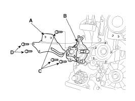 Install the water pump (B) and a new gasket with the 3 bolts (C).