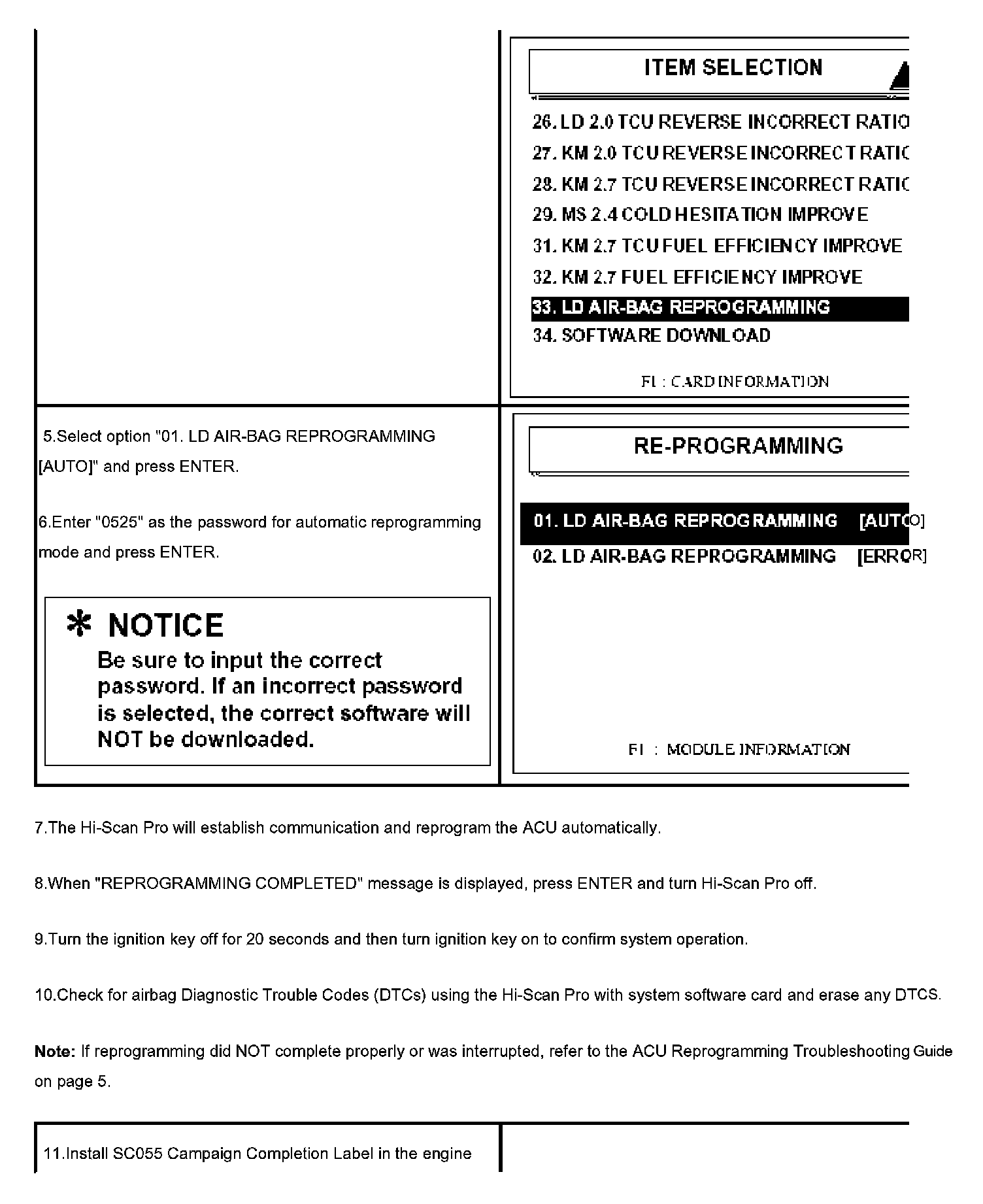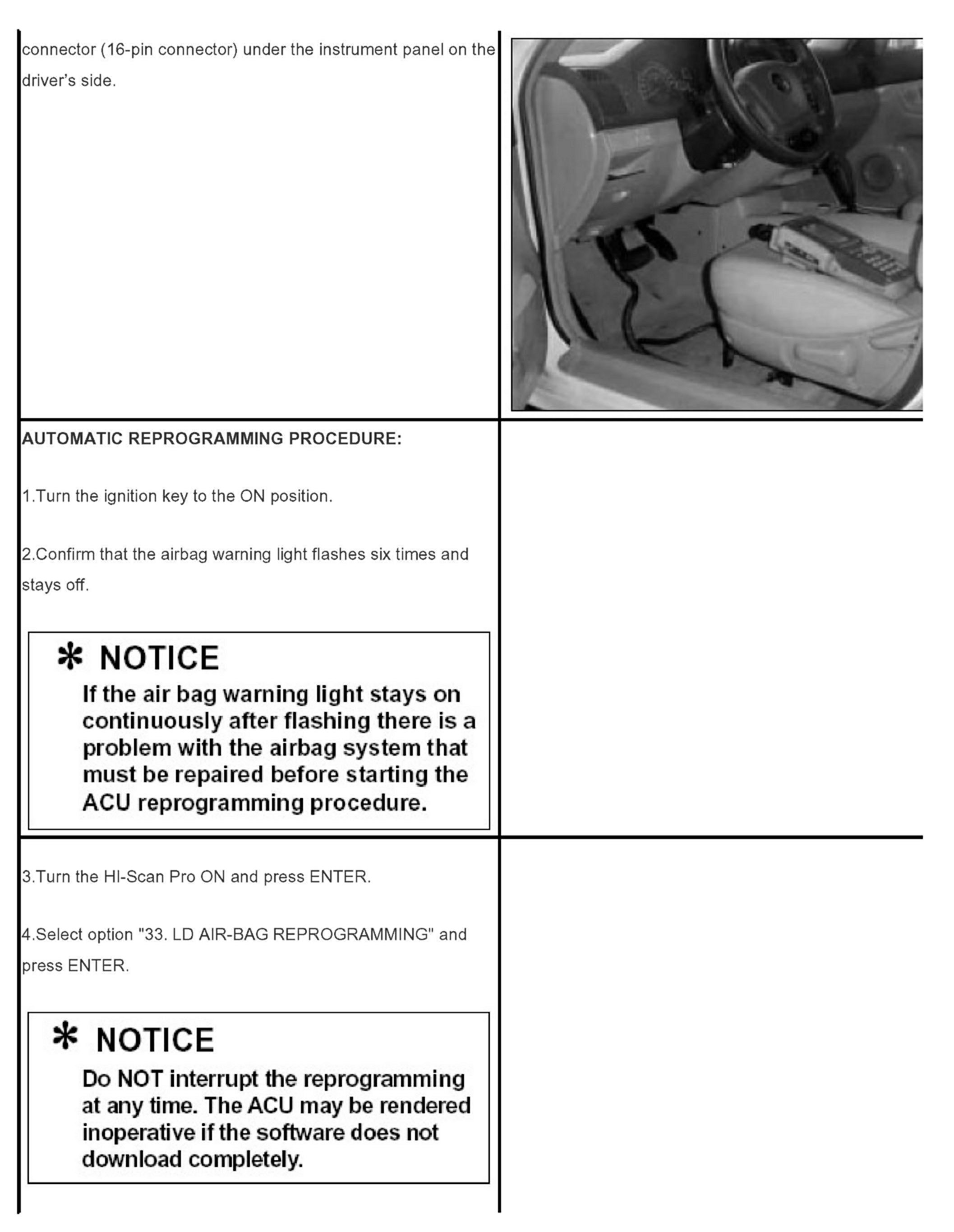 ^ ALREADY REPROGRAMMED or THIS ECM IS DIFFERENT TYPE": The reprogramming has already been done on vehicle or the ACU is not valid type for this reprogramming.