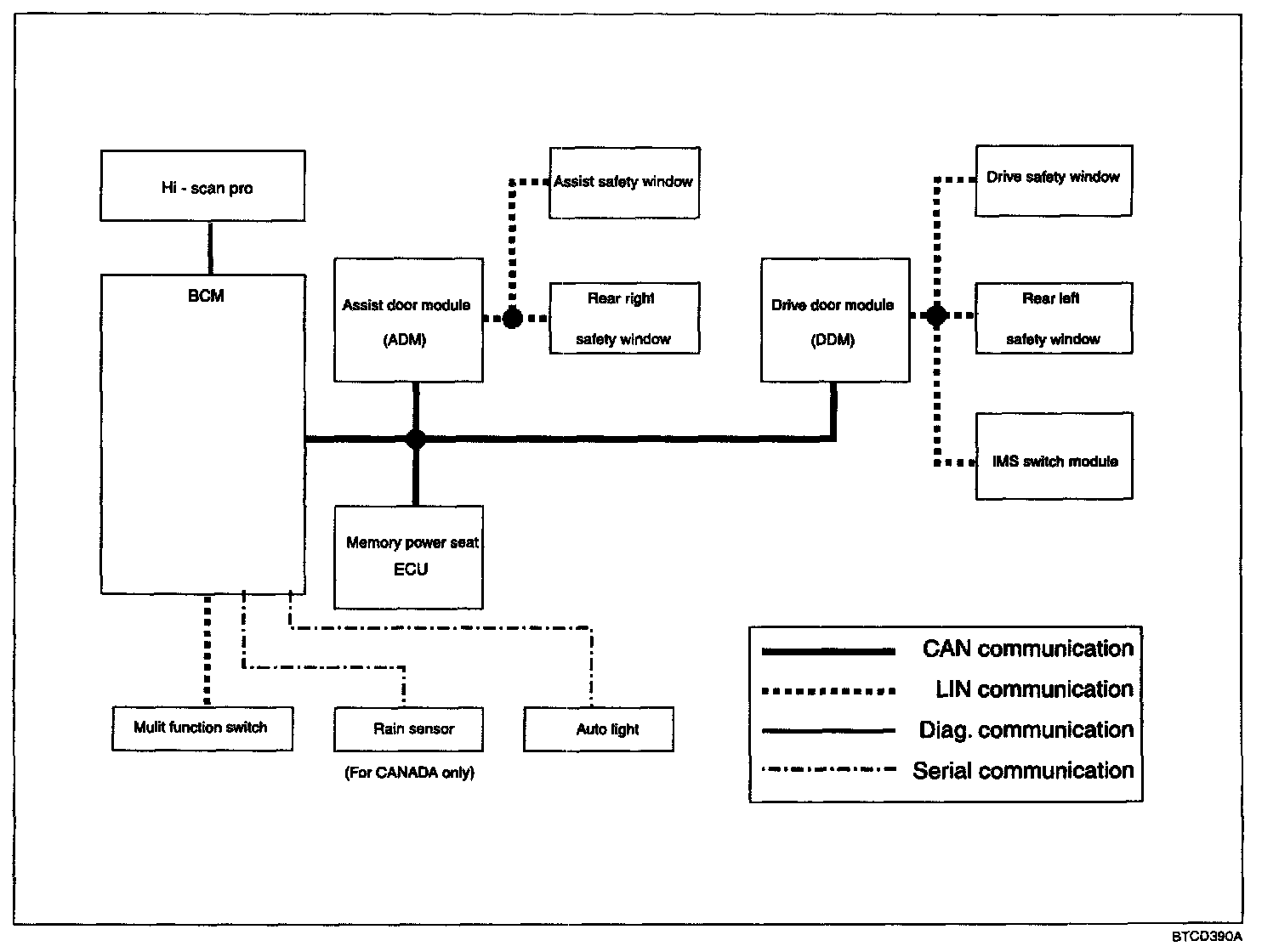The LIN (Local Interconnect Network) is a serial communications that efficiently supports the control of mecha-tronics nodes in distributed automotive applications. It is applied from Power window Switch to four SPW (Safety Power Window), Switch Module, BCM and Multi Function Switch. As the result, the high speed communication is set up by CAN and the low speed communication is set up by LIN. Additionally for diagnosing entire system, Hi-SCAN network is set up. This diagnosis communication can diagnose the condition (including actuator, switch, communication status) of each module which is connected to CAN system.