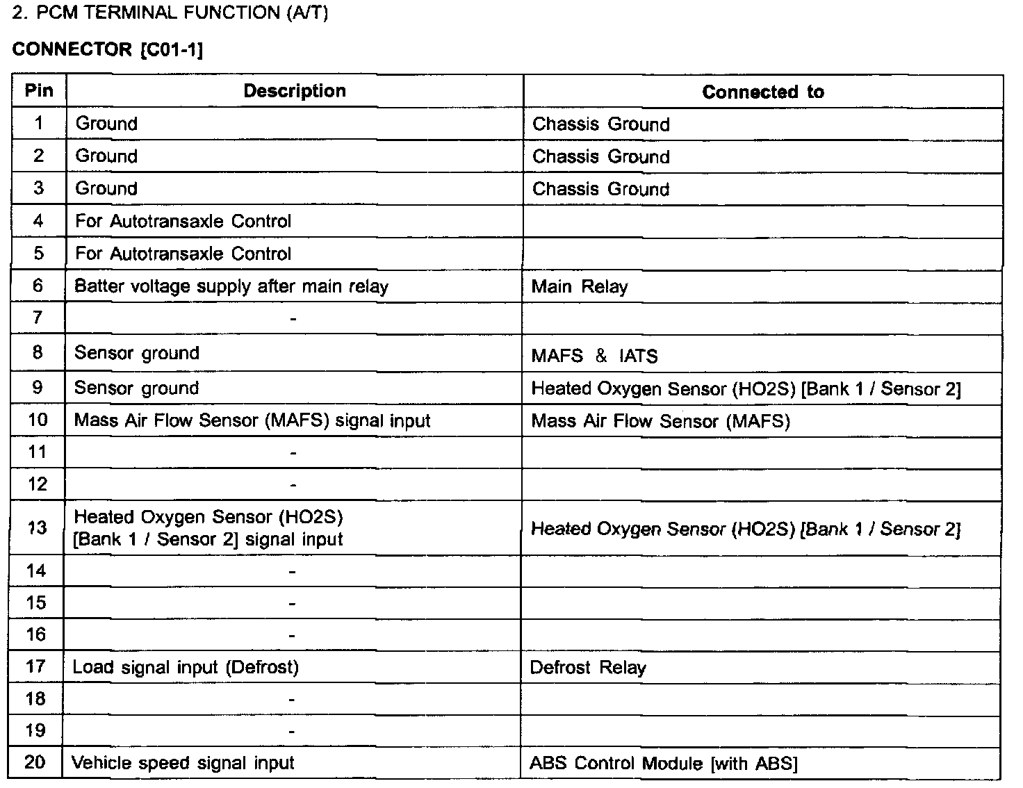 PCM TERMINAL FUNCTION (A/T) - CONNECTOR [C01-1]