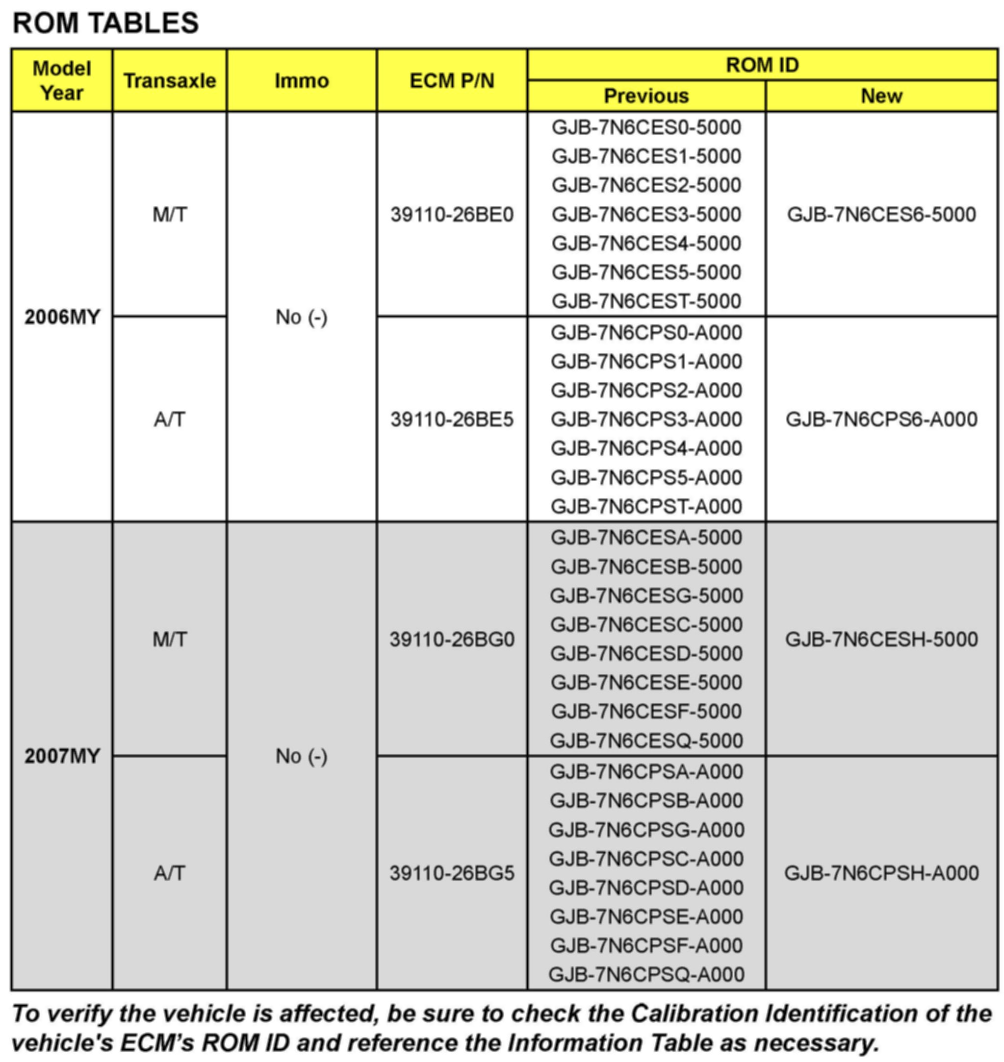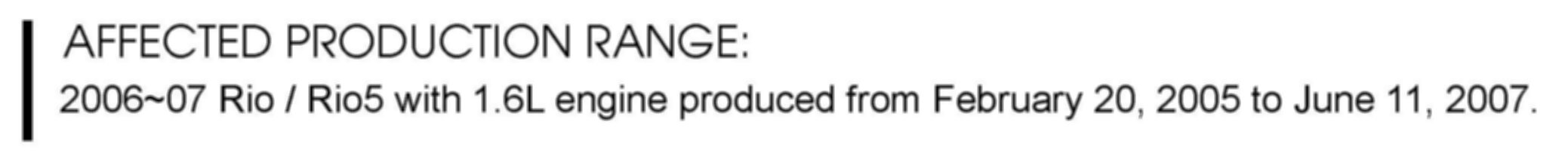 *This bulletin provides the procedure to upgrade the Engine Control Module (ECM) of some 2006-2007 RIO/RIO5 (JB) 1.6L vehicles produced February 20, 2005 to June 11, 2007 which may experience a rough idle during initial cold start-up period and/or illuminate the MIL with DTC's below. The ECM update addresses engine roughness/misfire that may occur in the first minute of idle after cold start with coolant temperature ranging from 30-70°F and other indicated upgrades referenced below. If the engine misfire continues beyond this period refer to service manual diagnostic procedures involving engine mechanical and engine control hardware issues. For confirmation that the latest reflash has been done to a vehicle you are working on, verify ROM ID using the tables in this TSB. This TSB supercedes all previous Rio Mis-fire P0300 publications except SA032 and SA036. Please discard any paper copies printed prior to April 2010 to ensure correct ROM ID is installed.*
