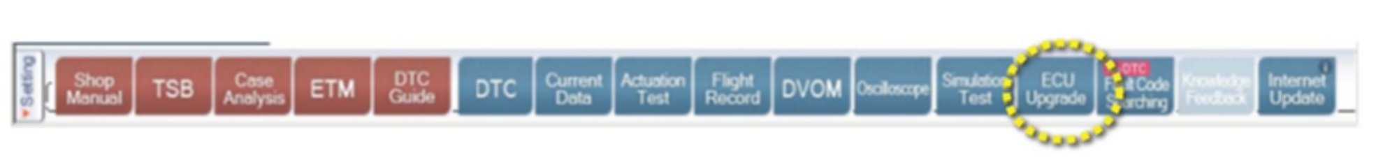 6. Once back at the GDS Main Screen, select ECU upgrade from the bottom right-hand corner. Next select Auto Mode, Engine. Perform the ECU upgrade in accordance with normal GDS tool ECU upgrade procedures.