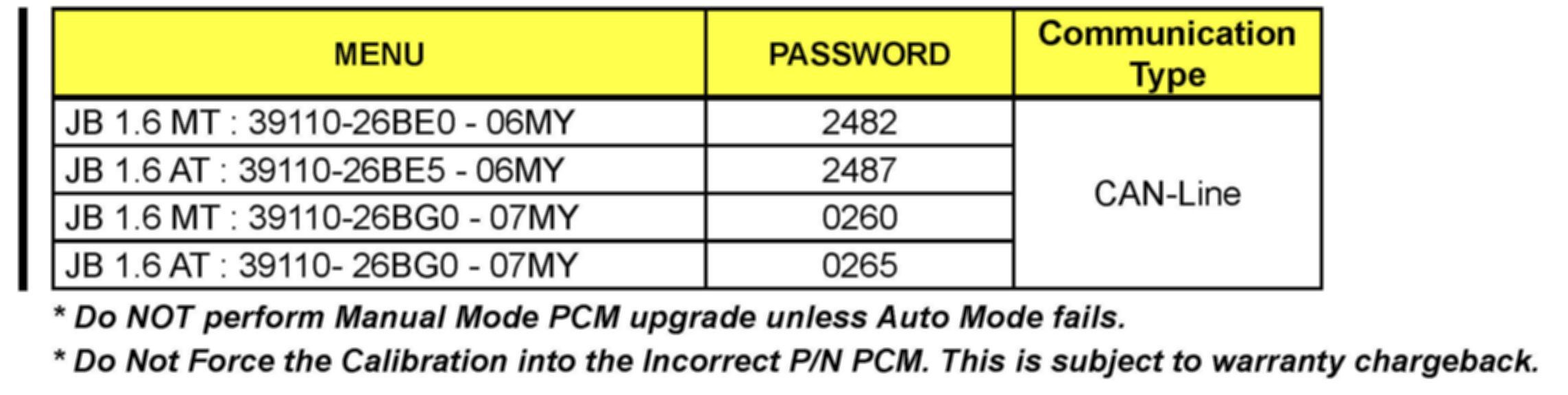 Do NOT attempt to perform a Manual Mode PCM upgrade unless Auto Mode fails. Always follow the instructions given on the GDS tool in either Auto or Manual mode. See table for Manual Mode passwords. In addition, a PCM reset is required if Auto Mode fails; refer to the table below for procedure.