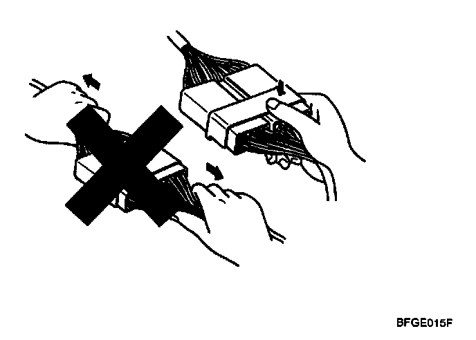b. When the connector is disconnected: Check for missing terminal, crimped terminal or broken core wire by slightly pulling the wire harness. Visually check for rust, contamination, deformation and bend.