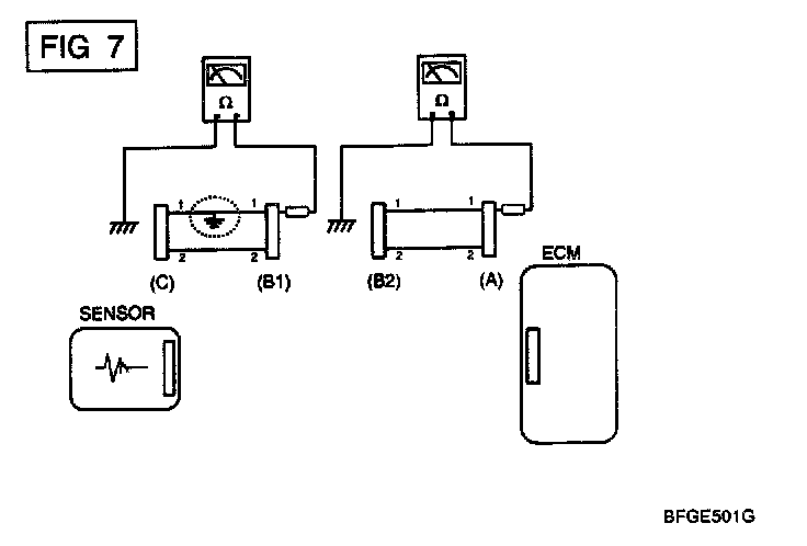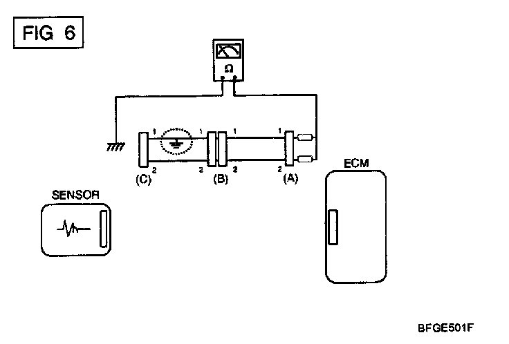 b. Disconnect connector (B), and measure for resistance between connector (C) and (B1) and between (B2). and (A) as shown in [FIG. 3].