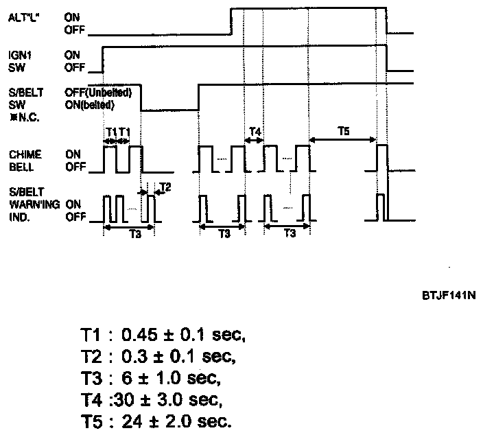 1. Warning Lamp lights every 0.6 sec and Warning Bell sounds every 0.9 sec for 6 sec when IGN1 switch is ON under unfastened S/Belt.