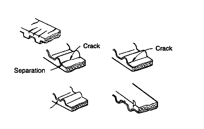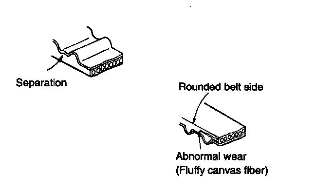 When the engine os overhauled or belt tension adjusted, check the belt carefully. If any of the following flaws are evident, replace the belt.