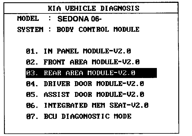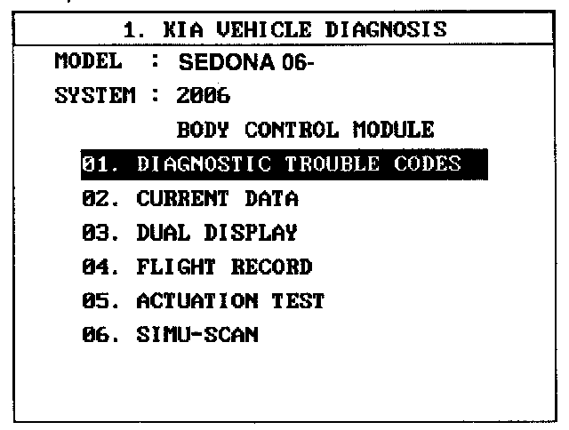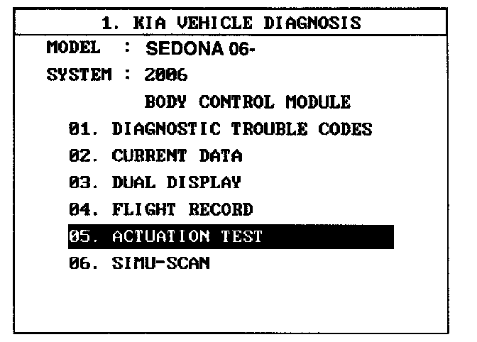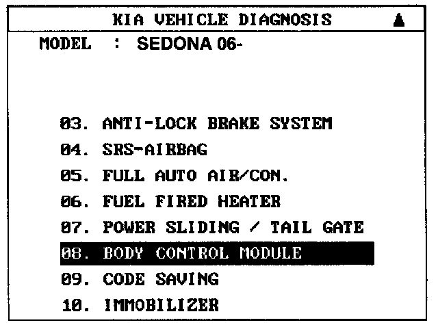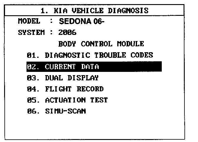 Home >> Kia >> 2006 >> Sedona V6-3.8L >> Repair and Diagnosis >> Powertrain Management >> Computers and Control Systems >> Body Control Module >> Testing and Inspection >> Scan Tool Testing and Procedures