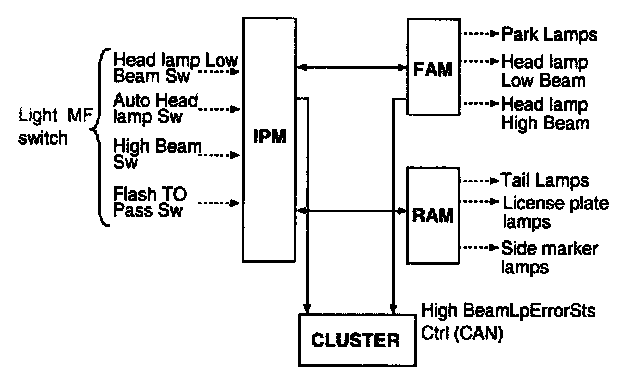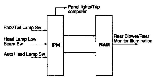 The MF "high beam" and "flash to pass" switches do not influence the management of the Panel Lights and Trip Computer illumination, Rear Blower illumination and Rear Monitor illumination.