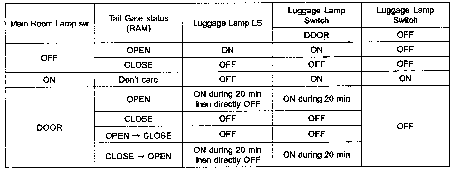 - After 20 minutes Luggage Lamp OFF at tailgate open, luggage lamps are turned ON again when: