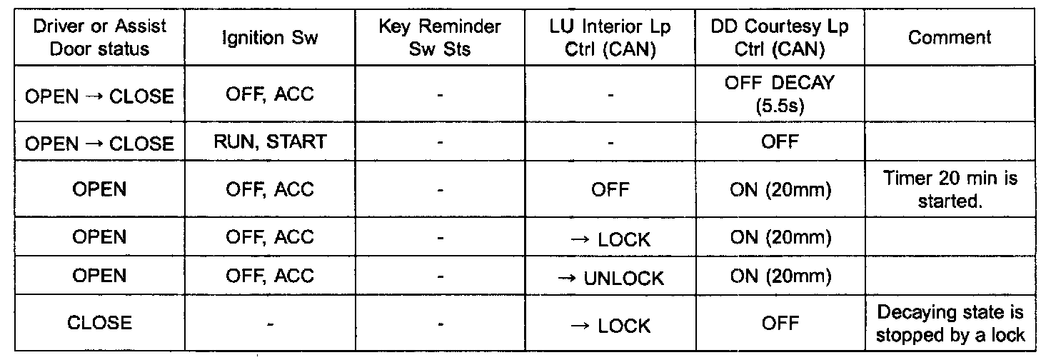 - If ignition key goes to RUN or START position during decaying, the RAM module sends CAN variable with OFF value to ADM(DDM) module and the assist courtesy lamp (Driver courtesy lamp) is turned off immediately.
