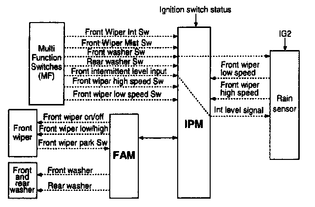 These functions are active when lgn2 switch ON In the OFF and ACC states, the front wiper is not activated. If IGN2 turns OFF during wiper operation, the wiper stops at the current position and will move to the park position on the next IGN2 ON. In these states. the front washer is not active.