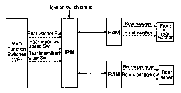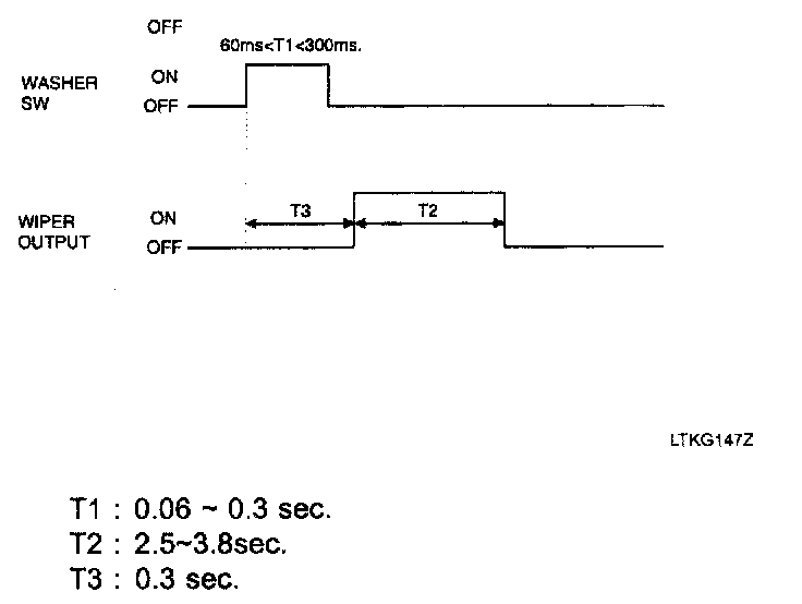 - If the washer signal is active for T1 (between 60 ms and 300 ms), the rear wiper output is turned on for T2 (2.5-3.8 sec.), T3 (300 ms) after the washer has been turned ON.