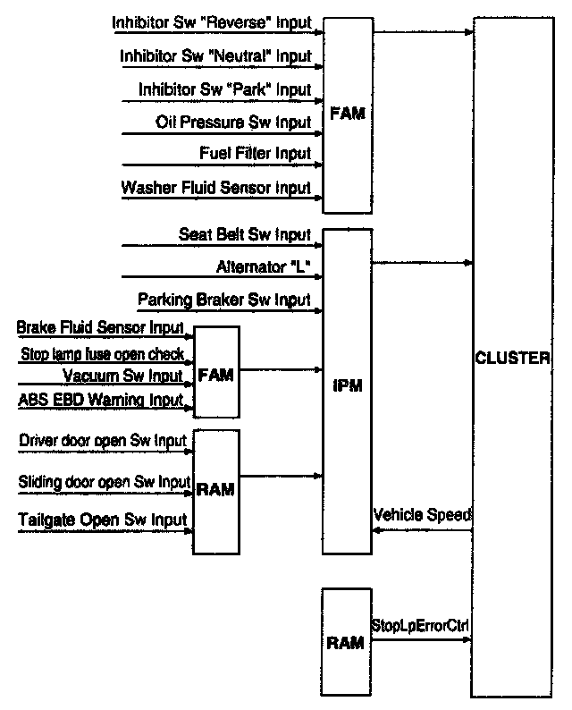 The IPM receives on digital input the status of the parking brake switch and by CAN network the status of the vacuum switch, the status of the ABS EBD warning, the status of the brake fluid sensor and the speed of the vehicle.