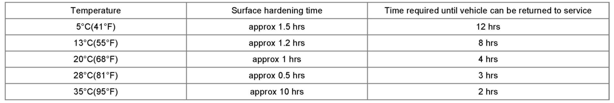 NOTE: The following cure times may be critical. Attempting to replace a windshield in ambient temperature over 35 degrees C (95 degrees F) should be avoided before completing the application.