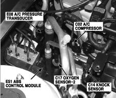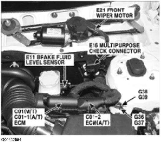 | ECM | Left rear of engine compartment. See Figure. |