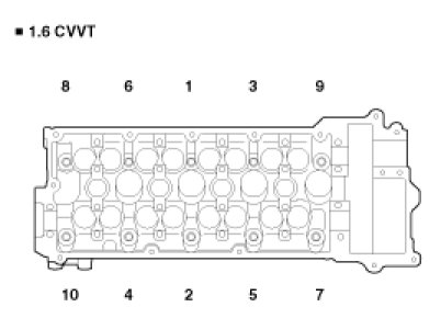 Tightening torque 29.4 N.m (3.0 kgf.m, 21.7 lb-ft) + 90 ° -> Release all bolts -> 29.4 N.m (3.0 kgf.m, 21.7 lb-ft) + 90 °