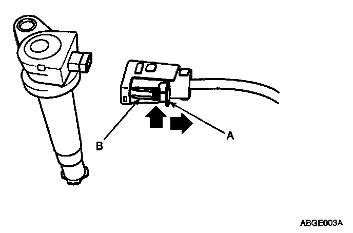 NOTE: When removing the ignition coil connector, pull the lock pin(A) and push the clip(B).