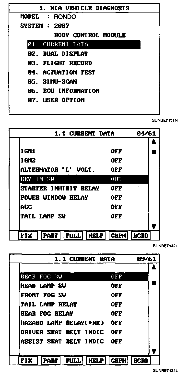 3. Select "Current data". if you will check current data of BCM. It provides power supply status, multi function status, lamp status, door status, lock system status, wiper, auto light status and so on.