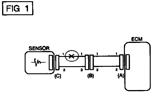 In [FIG.2.] the measured resistance of line 1 and 2 is higher than 1 Mohm and below 1 ohm respectively. Specifically the open circuit is line 1 (Line 2 is normal). To find exact break point, check sub line of line 1 as described in next step.
