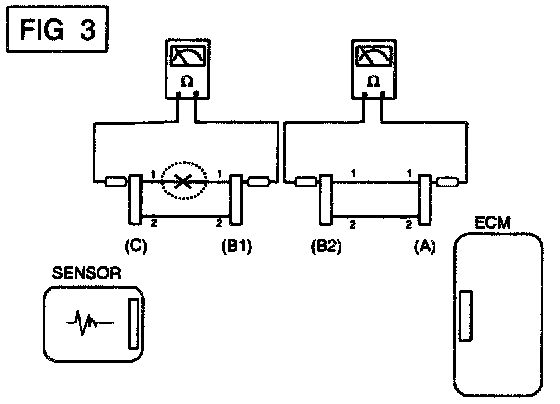 b. Disconnect connector (B), and measure for resistance between connector (C) and (B1) and between (B2) and (A) as shown in [FIG. 3].