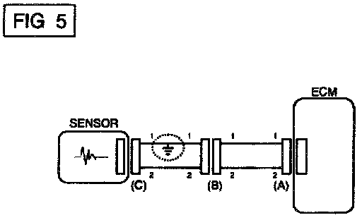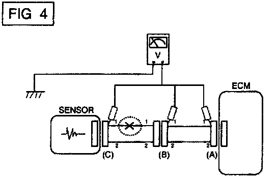 a. With each connector still connected, measure the voltage between the chassis ground and terminal 1 of each connectors (A), (B) and (C) as shown in [FIG. 4].