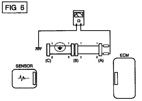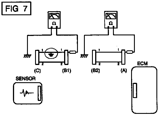b. Disconnect connector (B), and measure the resistance between connector (A) and chassis ground, and between (B1). and chassis ground as shown in [FIG. 7].